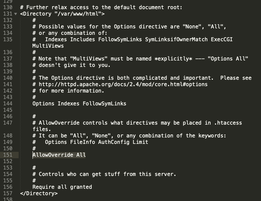 You’ll need to find (or create) a section that corresponds to the default document root: <Directory “/var/www/html”></Directory>. In that block, they’ll be a AllowOverride command that is set to “None”. That needs to be changed to “All” for our configuration file to work.
